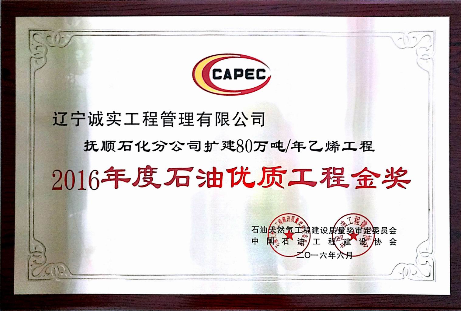 2016年石油優(yōu)質(zhì)工程金獎(jiǎng)(撫順石化分公司擴(kuò)建80萬(wàn)噸/年乙烯工程)
