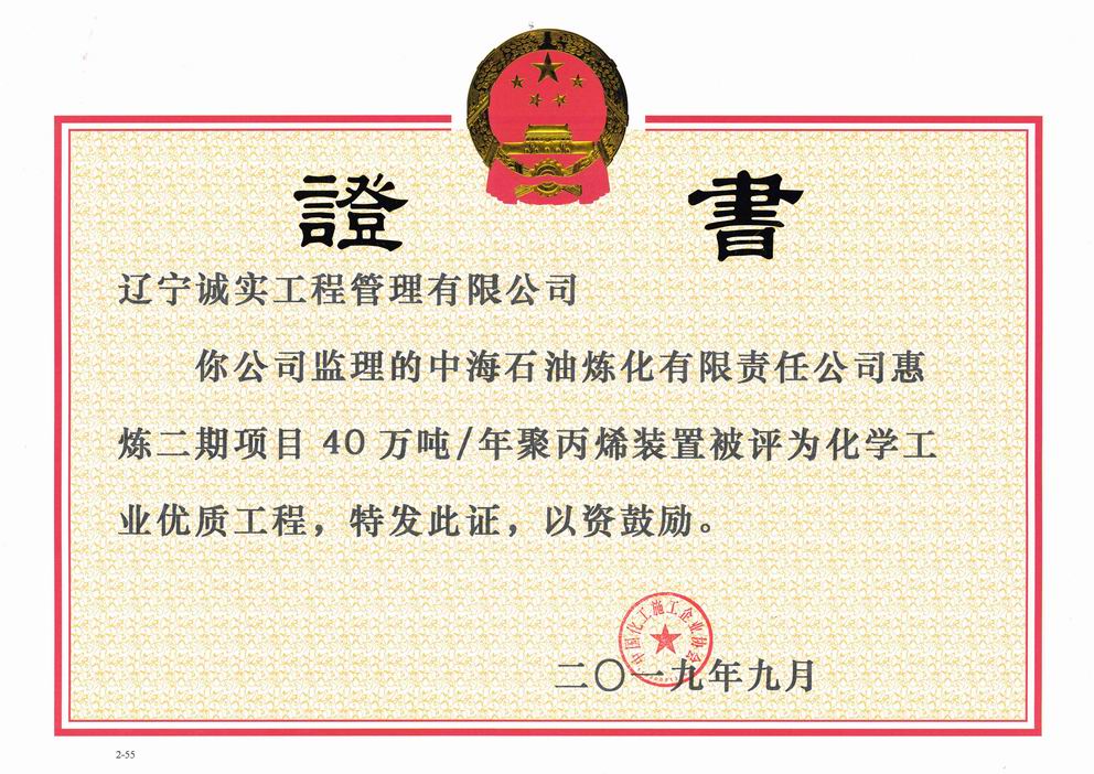 2019年化學工業(yè)優(yōu)質獎(中海油惠煉二期項目40萬噸/年聚丙烯裝置)