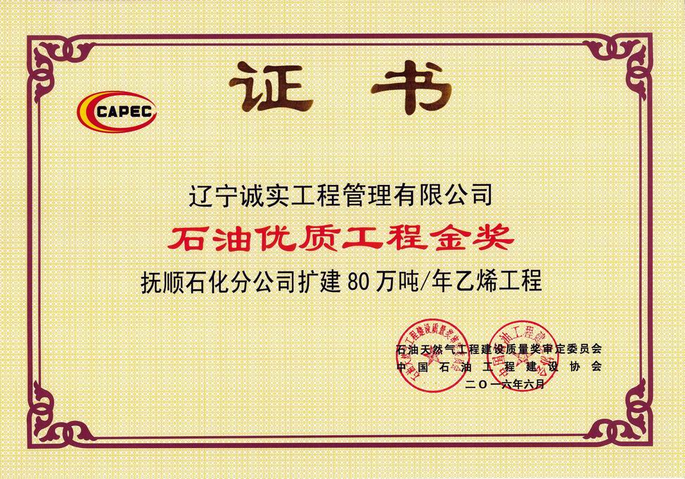 2016年石油優(yōu)質(zhì)工程金獎(jiǎng)(撫順石化...