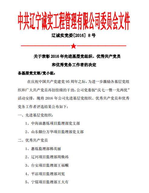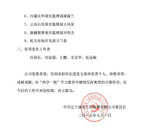 遼寧誠(chéng)實(shí)工程管理有限公司黨委召開(kāi)《慶祝建黨95周年暨“一優(yōu)兩先”表彰視頻大會(huì)》
