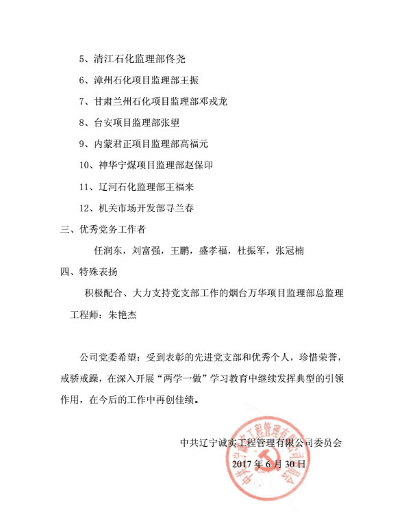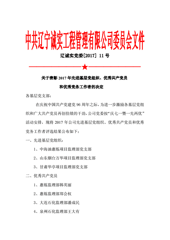 為慶祝中國共產黨建黨96周年,公司黨委于2017年6月30日下午在公司一樓會議室召開了慶祝建黨96周年暨“一優(yōu)兩先”表彰視頻大會。公司機關、撫順各項目監(jiān)理部及在撫的黨員同志在主會場參加了大會,中海油惠州項目監(jiān)理部黨支部、甘肅華亭項目監(jiān)理部黨支部、寧夏石化項目監(jiān)理部黨支部、中化泉州項目監(jiān)理部黨支部、廣西石化項目監(jiān)理部黨支部、蘭州石化項目監(jiān)理部黨支部、內蒙古君正項目監(jiān)理部黨支部、神華寧煤項目監(jiān)理部黨支部、煙臺萬華項目監(jiān)理部黨支部設立視頻分會場。黨委委員馬駿主持了視頻大會。首先,公司黨委副書記馮玉琢同志宣讀了“一優(yōu)兩先”表彰決定。接著,黨委書記孫學良結合公司實際做了慶祝建黨96周年的講話。最后全體黨員重溫的入黨誓詞,進行入黨宣誓。