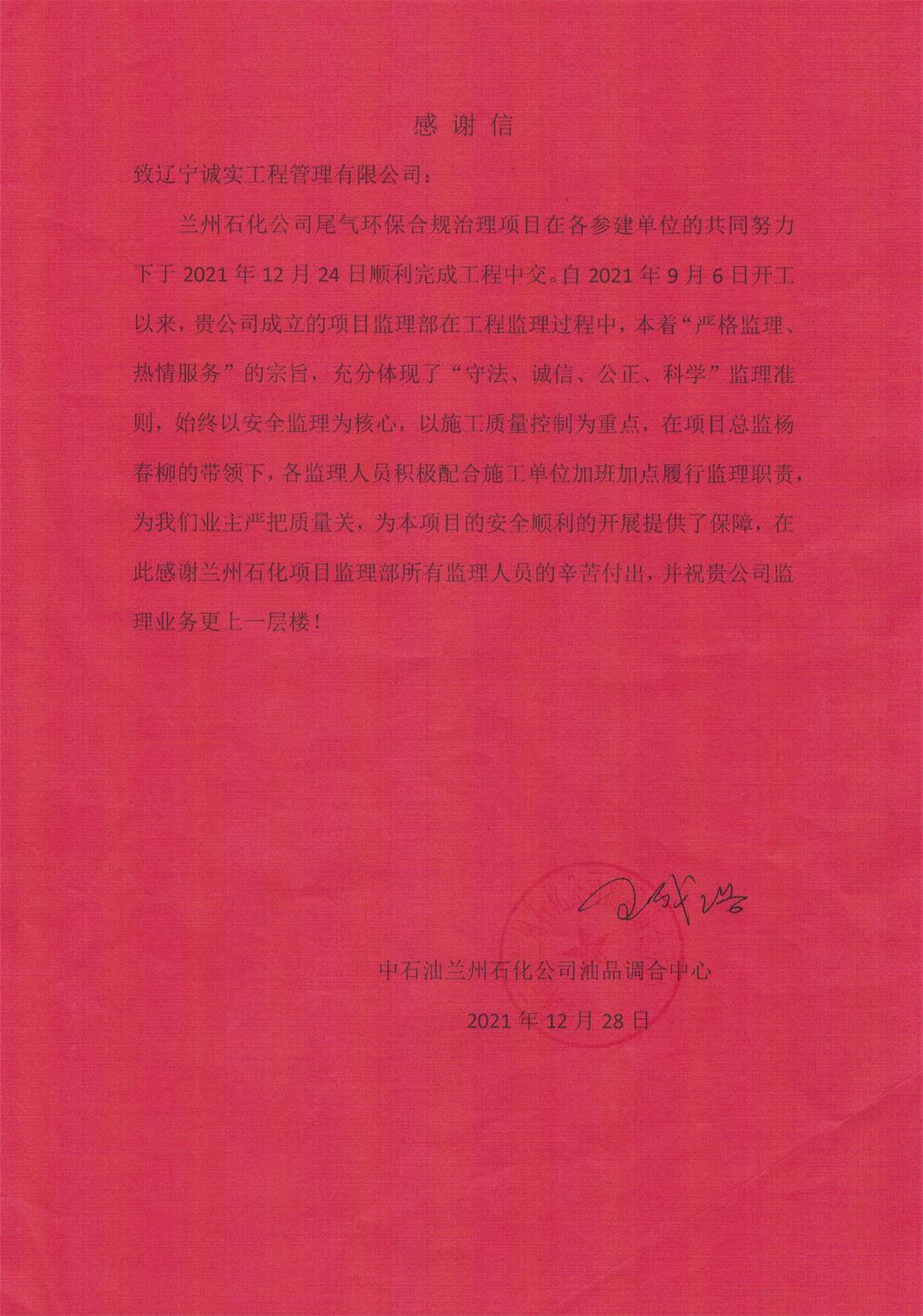 12月28日,蘭州項目監(jiān)理部收到中石油蘭州石化公司油品調合中心發(fā)來的感謝信。信中,業(yè)主單位對項目部全體監(jiān)理人員在項目開展過程中的工作表現(xiàn)給予了充分的肯定和高度的贊譽。這是對我公司卓越的項目管理水平和強大的人才隊伍的最好見證,同時也完美的展現(xiàn)了我們一貫以來“敢打硬仗、善打難仗、能打勝仗”的優(yōu)良傳統(tǒng)和作風。希望各項目部要以此為動力,不忘初心,牢記使命,擔當作為,為樹立誠實品牌、打造誠實形象再立新功!