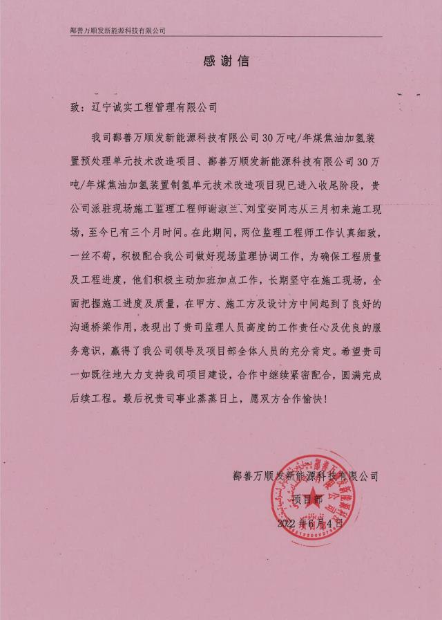 6月6日,公司新疆鄯善項(xiàng)目部收到業(yè)主單位的表揚(yáng)信。信中,業(yè)主言真意切地對(duì)我公司監(jiān)理人員在項(xiàng)目開展期間勤勉盡責(zé)的工作精神給予了高度的贊譽(yù)和充分的認(rèn)可。業(yè)主的表揚(yáng)是對(duì)公司綜合實(shí)力、服務(wù)質(zhì)量、技術(shù)水平的又一次肯定,誠實(shí)人必將以此為動(dòng)力,在嚴(yán)守安全底線、嚴(yán)把工程質(zhì)量大關(guān)的道路上砥礪前行!