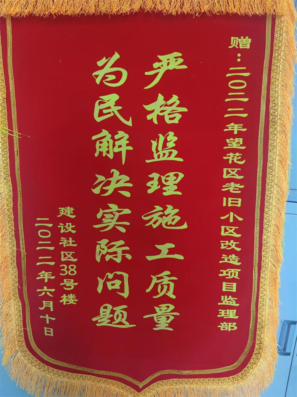 千濤萬(wàn)漉雖辛苦,吹盡狂沙始到金。一面錦旗既是一份肯定。我們將秉承“誠(chéng)實(shí)、責(zé)任、專業(yè)、超越”的監(jiān)理精神,接受政府和市民的共同監(jiān)督,一如既往、不忘初心、盡職盡責(zé),為推動(dòng)老舊小區(qū)改造,優(yōu)化小區(qū)環(huán)境治理,建設(shè)文明城市做出應(yīng)有的貢獻(xiàn)!