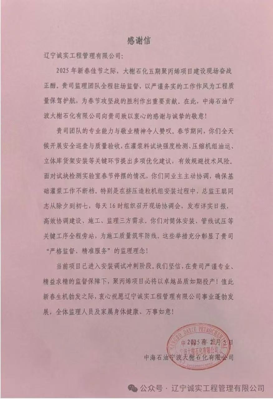 202525日,當(dāng)許多人仍沉浸在新春佳節(jié)的喜悅之中時(shí),中海油大榭石化五期聚丙烯項(xiàng)目監(jiān)理部以專業(yè)、奉獻(xiàn)的精神為項(xiàng)目安裝調(diào)試沖刺的關(guān)鍵過程保駕護(hù)航,并收獲到來自中海石油寧波大榭石化有限公司發(fā)來的一封感謝信。