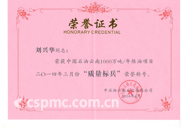 劉興華同志榮獲中國(guó)石油云南1000萬(wàn)噸/年煉油項(xiàng)目2014年3月份“質(zhì)量標(biāo)兵”榮譽(yù)稱(chēng)號(hào)